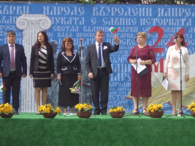 От сцената в центъра на площада, под звуците на химна „Върви народе възродени“ кметът на общината инж. Васил Панделиев, председателят на общинския съвет Халил Ахмед, зам. кметовете Хатидже Георгиева и Дияна Гурева, секретарят на общината Росица Чанева и гл. експерт Тончо Тончев приеха празничното шествие от представителните блокове на детски градини и училища от община Сунгурларе. Тържествено под звуците на химна на РБългария кметът инж. Васил Панделиев издигна националния трибагреник, а ученикът-отличник Явор Банов издигна общинското знаме. Инж. Панделиев поздрави учители, ученици, просветни и културни дейци, граждани. В словото си той подчерта, че 24 май е символ на духовното единение на нацията ни, празник на словото, на духа и културната ни идентичност, ден на почит и признателност към значимостта на святото дело на първоучителите, ден, който ни дава право на самочувствие, увереност и гордост. За дългогодишна високо професионална трудова дейност в системата на народната просвета, за опазване и развитие на българската духовност и за принос в развитието на музейното дело той награди с почетни плакети изявени учители, музейни работници и читалища.